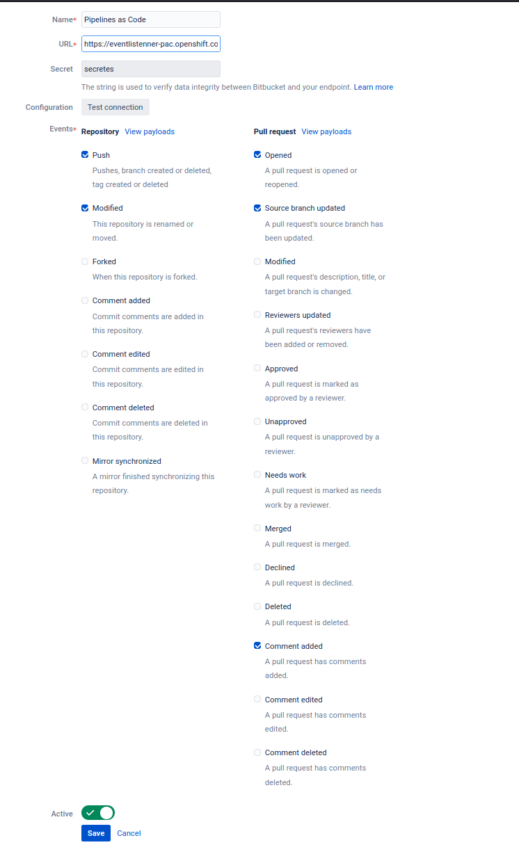 Set the payload URL to the Pipelines-as-Code public URL. On OpenShift, get the public URL of the Pipelines-as-Code route like this: